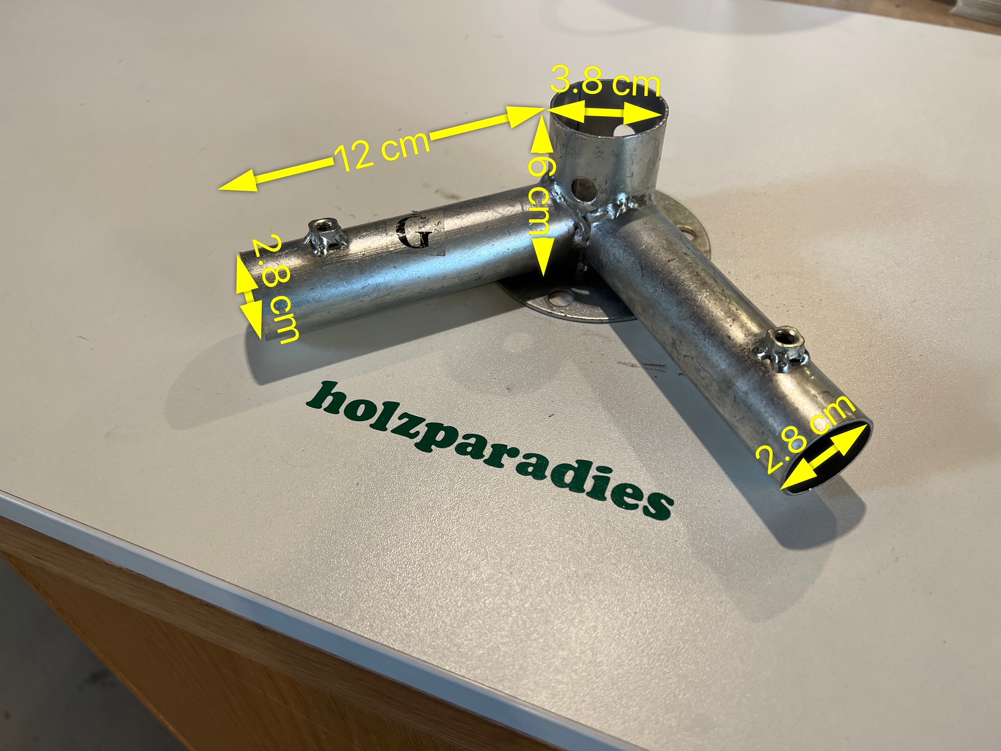 ACHTUNG Hier wird ein Eckfußverbinder verkauft: Senkrechtes Rohr 38 mm und die Horizontalen ca. 27/28 mm. Häufig mit dem Aufkleber G.